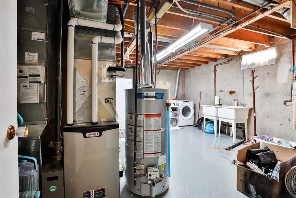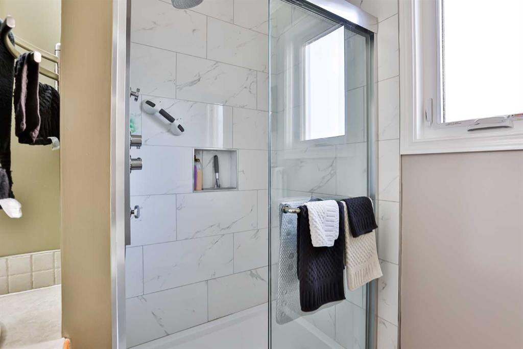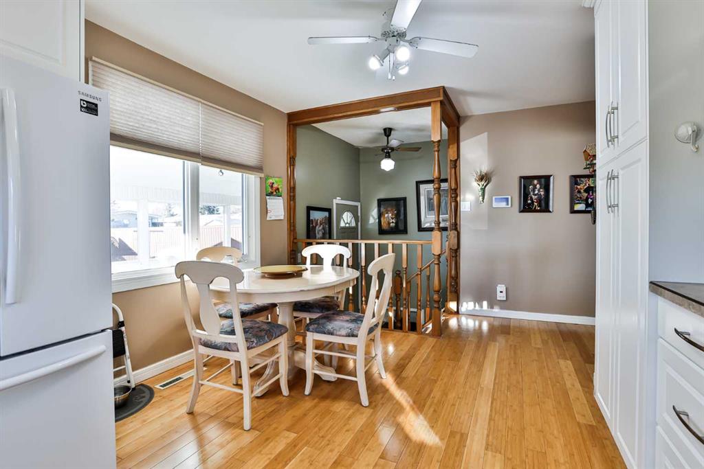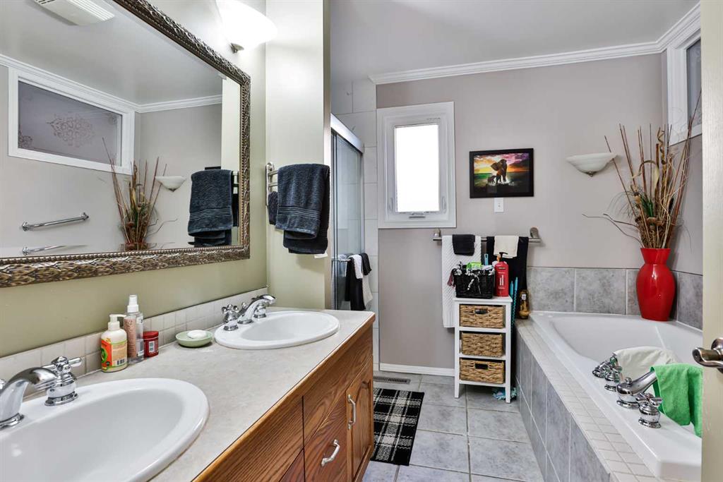 Immaculate and Move-In Ready! This beautifully maintained bungalow with 2 bedrooms and a den up, 1 bedroom down offers numerous upgrades and an ideal location close to elementary, middle, and high schools—as well as parks, a swimming pool, and an ice arena. The custom-crafted kitchen features white cabinetry, new countertops, a stylish tile backsplash, custom blinds, and elegant bamboo flooring. The primary bedroom is directly adjacent to the main bath, showcasing a jetted tub, dual sinks, ceramic tile floo...