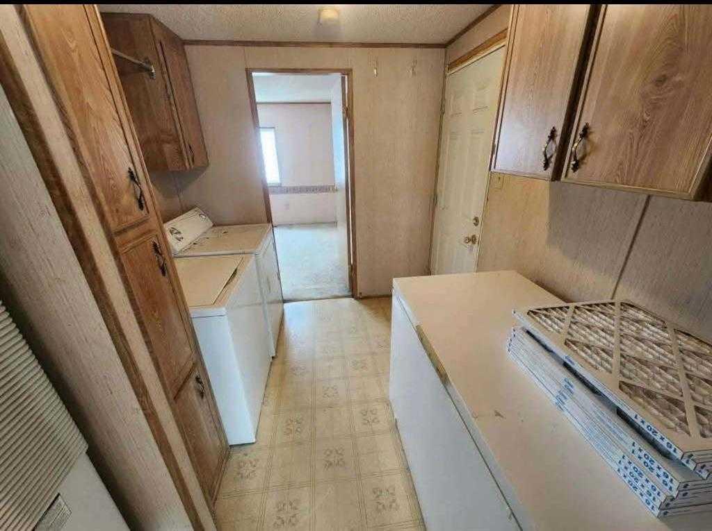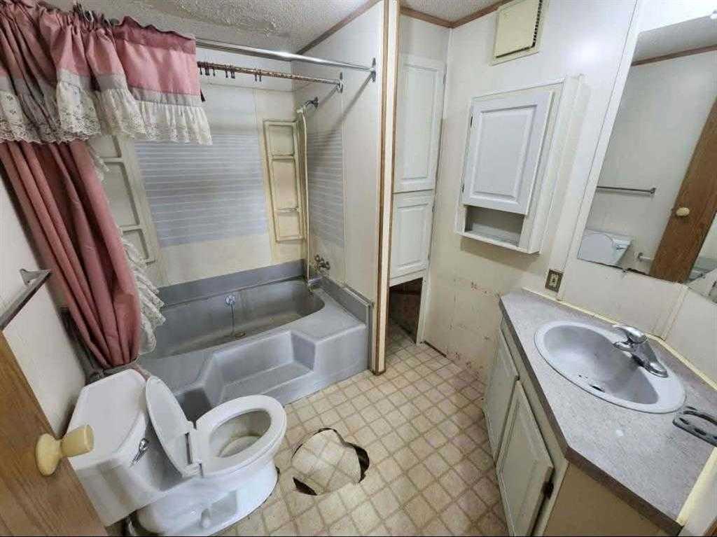 THIS HOME IS SOLD, AS IS CONDITION. The walls with no panel were never finished inside after new windows and wall repairs were made about 15 years ago. Shingles were replaced about 3 years ago, damage to ceiling in a few areas happened before shingles were done. Floor damage in ensuite was from a fall. Buyer must be approved by Mobile home park to rent the lot the mobile is on.
