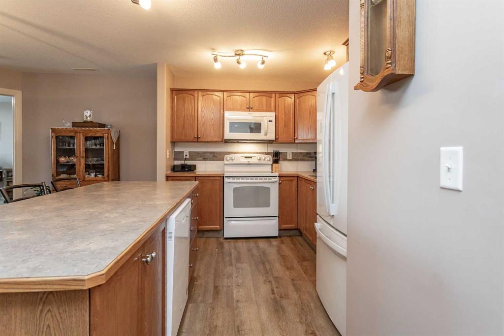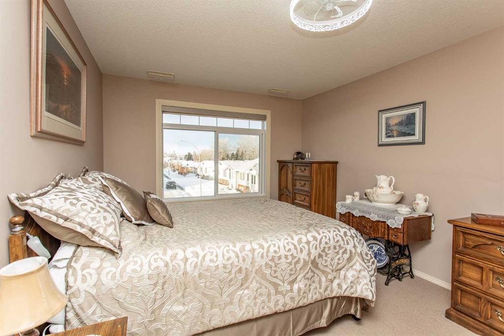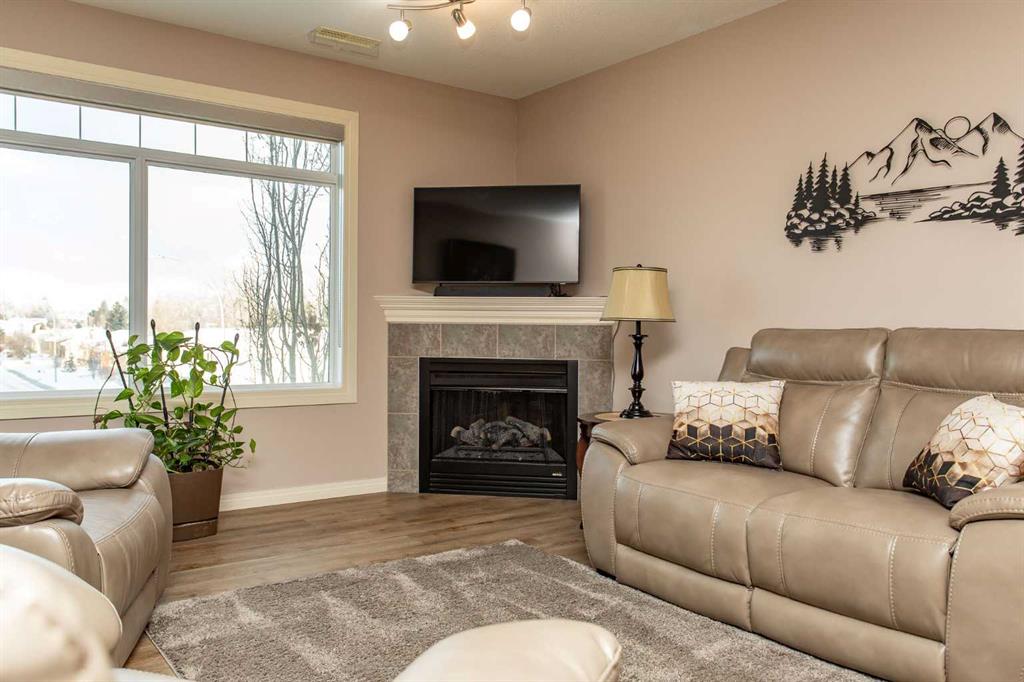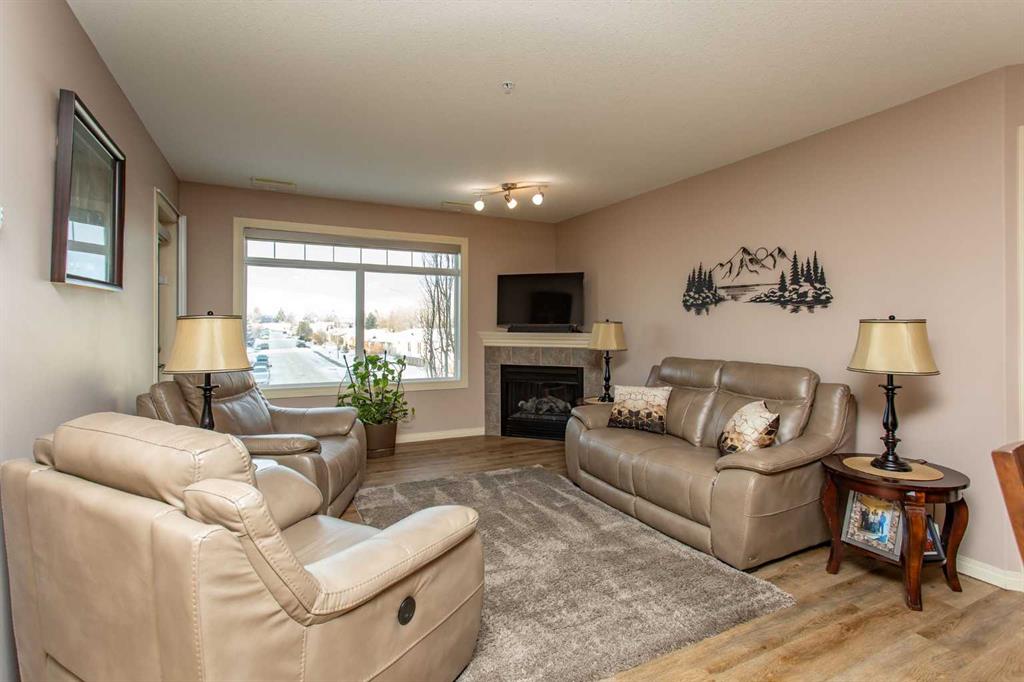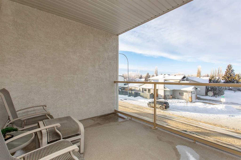 Chateau Lacombe offers an exceptional opportunity to own a condominium in one of Lacombe's premier adult living developments. Conveniently located within walking distance to downtown amenities, shopping, and walking trails, this centrally situated project provides both comfort and accessibility. This well-maintained second-floor unit features west-facing windows with attractive views of the surrounding residential neighborhood. Recent updates, including new flooring, backsplash, blinds, one year old refrige...